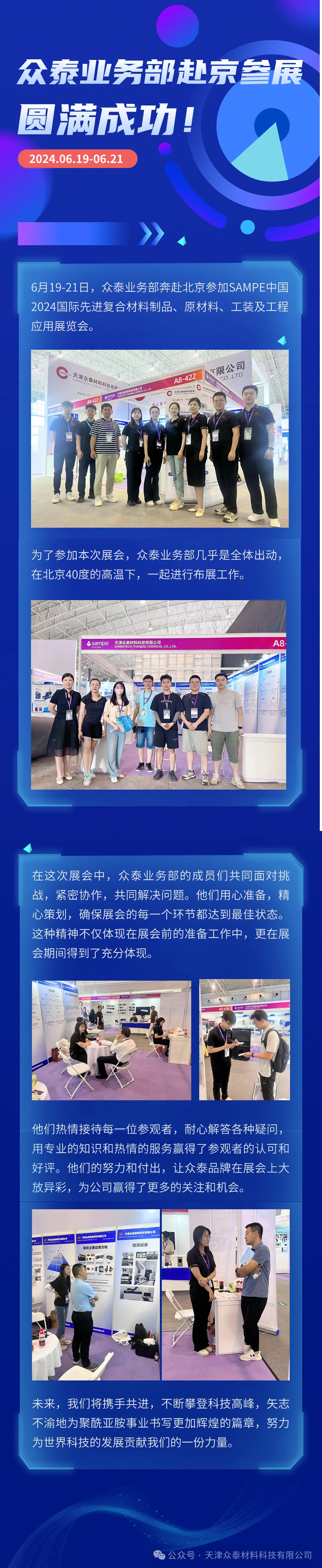 6月19日-21日,眾泰業(yè)務部奔赴北京參加SAMPE中國2024國際先進復合材料制品、原材料、工裝及工程應用展覽會。在這次展會中,眾泰業(yè)務部的成員們共同面對挑戰(zhàn),緊密協(xié)作,共同解決問題。